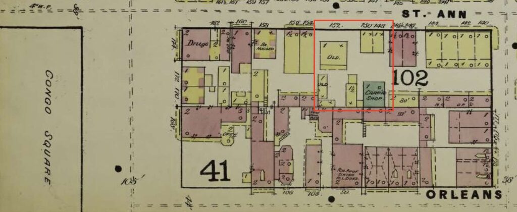 What we see jibes with old eyewitness accounts from the Louisiana Writers Project work (1930s). They interviewed old people who knew the family, taking oral history. The house is old. It was set back from the street, unlike all the others. It was a wood frame construction, one story tall. Probably had a shingle roof (the fire map says it’s not tile). Witnesses say the front yard was behind a fence, had banana trees, and a pomegranate. The outbuildings out back would have, at the time, included a kitchen, a privy, maybe a chicken coop.